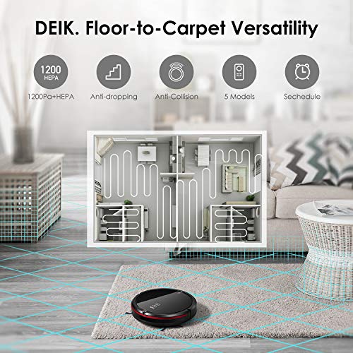 Upgraded 3-Stage Cleaning System: Larger wheels for climbing thresholds. A redesigned rolling brush wider and 2 side brushes pull in debris from corners and edges, V-shaped rolling brush and 1200Pa powerful suction robotic vacuum to ensure a thorough clean, focus on picking up hairs, dirt, debris.Floor-to-carpet Versatility: DEIK Robot vacuums are built with 4+ smart clean technology for floors and carpets. Smart motion guided auto-clean mode, plus single room & spot mode for targeted cleaning, & edge mode for hard-to-clean edges.