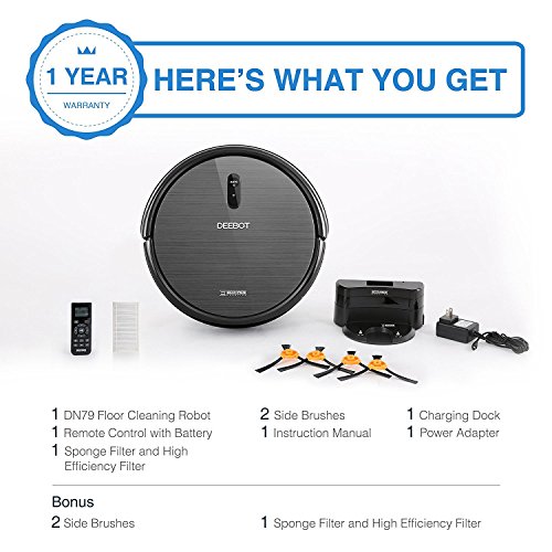 1 Year Warranty, plus Accessories: Includes (1) remote control, (4) side brushes, (1) power adapter, (1) docking station & fantastic customer support!