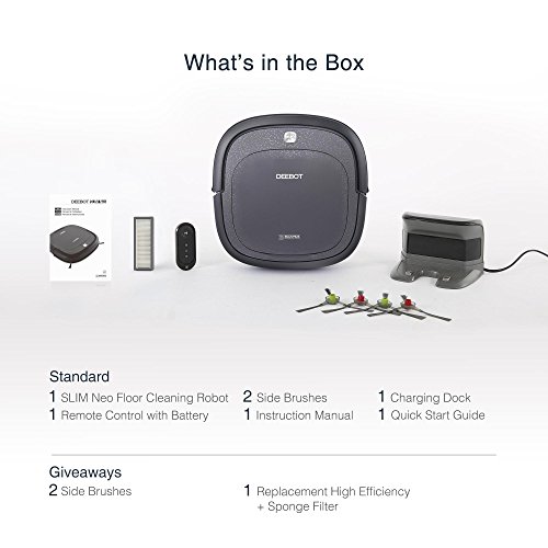 DEEBOT SLIM is easy to operate and maintain and automatically adjusts to uneven surfaces for optimal cleaning. Equipped with SMART MOTION Technology, DEEBOT SLIM covers your floors multiple times ensuring that the persistent dirt has been removed. It also cleans up to and around stairs, detects objects in its path, recharges automatically and can be scheduled to clean once per day, even when nobody is home.Compact, Low-Profile Design: At 5.7-cm/ 2.2-inches tall, the Slim Neo can clean more of those hard-to-reach places where dust build-up can be particularly bad