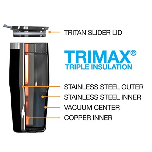 The Metro vacuum insulated tumbler features our signature TriMax Triple Insulation that will keep your drinks cold for 24 hours and hot up to 6 hours. Its distinctive styling and slider open and close top make it the perfect travel companion for filling at your coffee or smoothie shop. The Metro is made of 18/8 food grade stainless steel, and is BPA and condensation free It's a versatile 16 ounce vacuum insulated tumbler that is perfect for coffee, beer, or your favorite cocktail. It is cup holder friendly and has a soft silicone base that provides a quiet landing when setting it down. The durable powder coated finish is available in a choice of 5 colors.TRIPLE INSULATED WATTER BOTTLE: The triple insulation will keep your drinks cold for 24 hours and hot for 6 hours