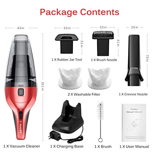 【ALL-ROUND CLEANING】HoLife vacuum cleaner helps you clean sofa seams, staircase corners, car crevices, and other hard-to-reach places with three different accessories whether at home or your vehicle. Note: Rubber jar brush can absorb not more than 100ml liquid.