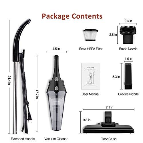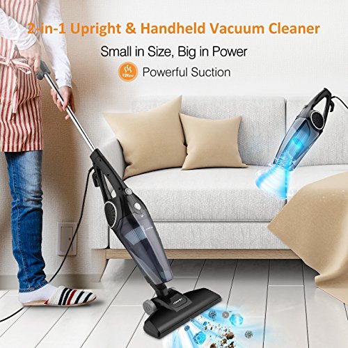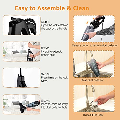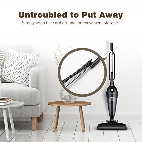 【Powerful Dual-Mode Vacuum Cleaner】: This 2 in 1 handy stick vacuum cleaner with 600w powerful motor and 12kpa produced cyclonic and strong suction easily sucks up various kinds of fine dust. With cyclone HEPA filtration system you can use it to clean sofa, table or crevice and it will lock in small particles with sponge filtration, to prevent the spread of allergies and bacteria, eliminating secondary pollution.【Comfortable Operation & Lightweight】: The lightweight vacuum cleaner, with a 360°rotatable floor brush and sleek wheels allows your easy movement for effortless vacuuming. You can fully enjoy the movement freedom and feel easy to clean every corner of your home or car.