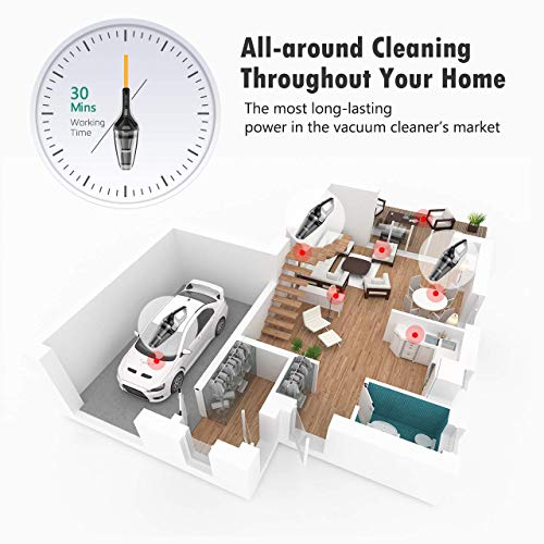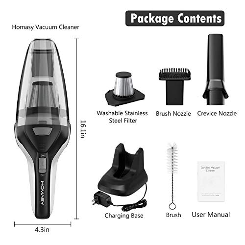 【Super Long Cleaning Time】Adopted 4x2200mAh high capacity lithium-ion batteries with working time up to 30 minutes, Homasy now possesses the longest sucking time in the market of handheld vacuum cleaners. At the same time, the portable vacuum goes with a 600ML large-capacity dust collection cup to meet the need of deep cleaning dust needs from your kitchen, living room to bedroom.