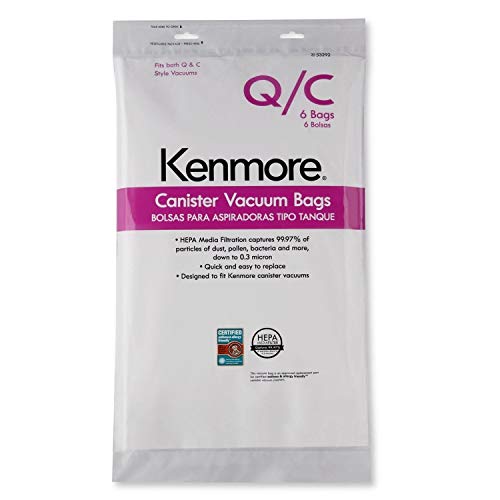 Kenmore type Q/C vacuum bags provide HEPA filtration for certified asthma- and allergy-friendly canister vacuums. This package of Kenmore type Q/C vacuum bags contains 6 replacement vacuum bags for select Kenmore canister vacuum cleaners.Fits Kenmore canister vacuum cleaners that use type Q replacement bags