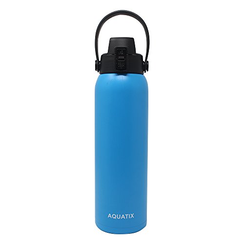 The Aquatix Sporty 32 oz Double Wall Insulated Stainless Steel Water Bottle is perfect for use at the gym, at the office, around your house and anywhere you need to take your beverage of choice with you. Made from durable and sturdy PREMIUM QUALITY, Top Chef 18/8 FOOD GRADE STAINLESS STEEL, this Aquatix Sporty 32 ounce water bottle is a great eco friendly sports bottle. The double wall insulated water bottle is PERFECT for carrying while walking, hiking, camping, use at the gym or just on the go- as it fits MOST car cup holders. No more spills and messes while driving! Ditch those plastic water bottles! GO HEALTHY with this BPA Free, FOOD GRADE stainless steel water bottle that holds a large capacity of liquids 32 fluid ounces and no longer worry about toxins and chemicals leaching into your beverage. Drink crisp, clean, healthy and refreshing drinks from Your Aquatix Water Bottle every time. Just Fill and Go! This sporty bottle features a flip top spout drinking mechanism allows the ease of staying hydrated even while on the go! The flip cap top provides single-handed drinking ability and is perfect for your busy life on the go! Stay hydrated and DRINK MORE WATER with this large capacity 32 ounce water bottle. Double vacuum insulated wall construction contributes to hot teas, soup, coffee or other blends being consistently hot for up to 6 hours. And, for cold water, smoothies, soft drinks, or anything you may need very cold, 24 hours of insulated confidence, guaranteed cold, period! The bottle will not "sweat", meaning it will not create condensation which may leave a "ring" of liquid on your expensive buried walnut side table. Easy to hand wash or clean, NO aftertaste after cleaning. COLD LIQUIDS or HOT LIQUIDS! This is a double wall insulated water bottle that is made of 18/8 food grade stainless steel water bottle! No other bottle has all the features of our Aquatix Sport Bottle!Best Stainless Steel Water Bottle Or Your Money Back! - If Our 100% Pure Stainless Steel Sport Water Bottle (with No Plastic Lining Or Dangerous BPAs) Isn't The Best Sport Bottle you have ever tried we will Give You All Your Money Back! 100% GUARANTEED!!!