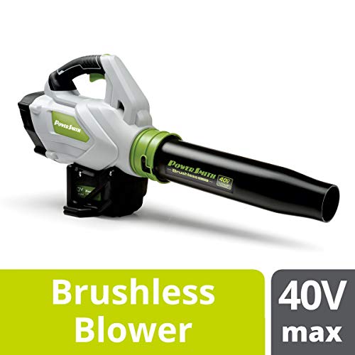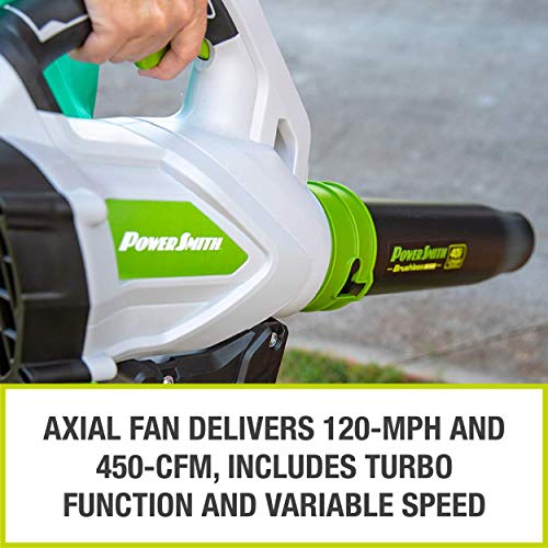 Looking for a battery-powered leaf blower strong enough to tackle tough piles of leaves and debris? The Powersmith 40V rechargeable leaf blower clears yard debris at speeds of up to 120 MPH. Designed with an axial fan, this cordless leaf blower delivers a high-efficiency airflow yet weighs just 6.6 pounds, making it easy to cart around the yard. Powersmith's 40-volt lawn tools are part of an eco-friendly range that uses lithium-ion batteries instead of gas, which reduces emissions and delivers significant fuel savings. The 40-volt leaf blower comes with its own battery and battery charger, which can be used with any 40-volt Powersmith lawn tool. The 2.5 Ah battery delivers 10 minutes of runtime per charge.Brushless motor with an innovative jet fan design offer powerful speeds up to 120-MPH with a 450-CFM
