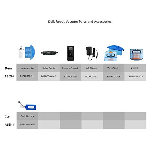 Buy other Deik Parts via ASIN #: battery (B07CNWVXNN) , roller brush (B07DTDBWMQ) , water tank (B076KGYK96) , HEPA filter (B07CJ4NSD5)