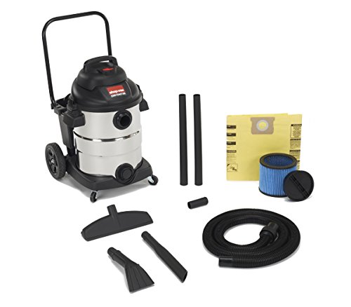 Shop-Vac 10 Gallon stainless steel 6.5 peak HP wet/dry vac includes 12' x 1 1/2" LockOn hose, 2- 1 1/2" extension wands, 14" floor nozzle, 16" crevice tool, claw utility nozzle, Ultra Web cartridge filter, high efficiency disposable filter bag.Stainless steel tank