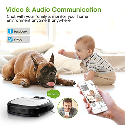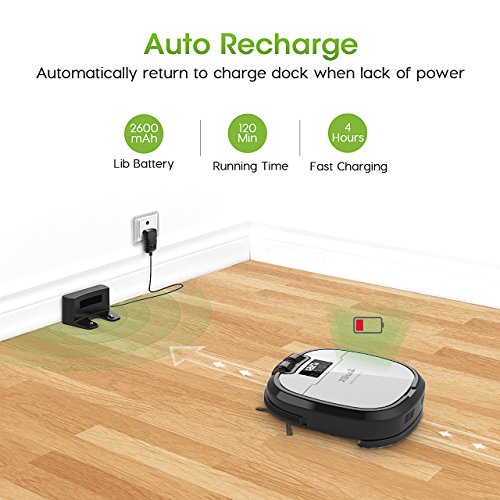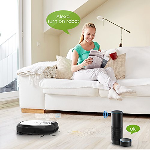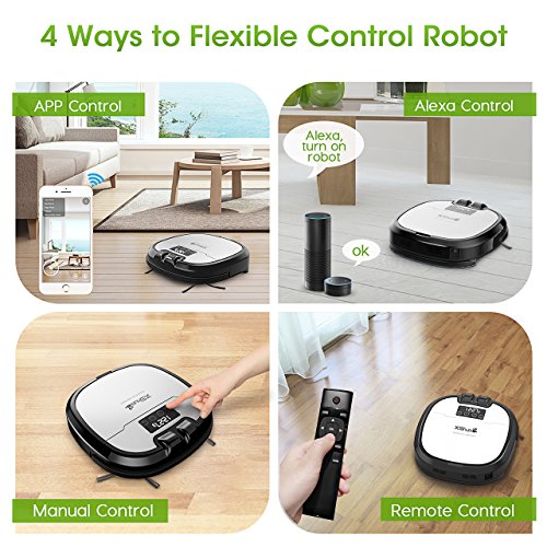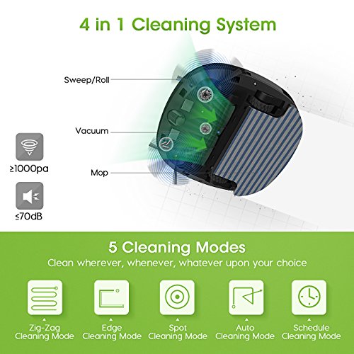 4-in-1 Robotic Vacuum Cleaner--Sweeping, Vacuuming, Rolling, Mopping You can either use the vacuum port with a strong suction for a concentrated cleaning or bristle brush for picking up hairs & various debris. Also you can use a reusable mopping cloth & water tank to mop clean off paw prints and small liquid spills for entirely thoroughly cleaning. 5 Cleaning Modes--Meet All Your Cleaning Needs Zig-Zag Cleaning Mode: For open area cleaning & mopping Edge Cleaning Mode: For edges & corners cleaning Spot Cleaning Mode: For concentrated dust cleaning Auto Cleaning Mode: For efficient daily cleaning Schedule Cleaning Mode: For cleaning as your plan Multiple Languages Available APP supports 11 languages: English, German, French, Spanish, Korean, Russian, Portuguese, Italian, Japanese, Hebrew, and Chinese User Manual offers 5 languages: English, German, French, Spanish, and Italian Tips: 1. Clear up excess clutter on floor before cleaning (e.g. cables, bar stools, toys, etc). 2. Empty dust box and clean HEPA filter after each use. 3. Put charging dock in a wide open area. Specification Materials: ABS, PC Suction Power: 1000pa Airflow: 12000r/min Noise: <70db Dust Capacity:0.83L Water Tank Capacity: 0.1L Filter: HEPA Climbing Height: 15° Over Obstacle Height: 10mm Input Voltage:100-240V Battery: Lithium Battery 2600mAh 14.4V Charge Time: 4~5hrs Working Time:90 minute (cleaning) + 30 minute (back recharging) Units size: 34x9(cm) Weight: 3.0kgRobot vacuum cleans can covers every corner of your hom